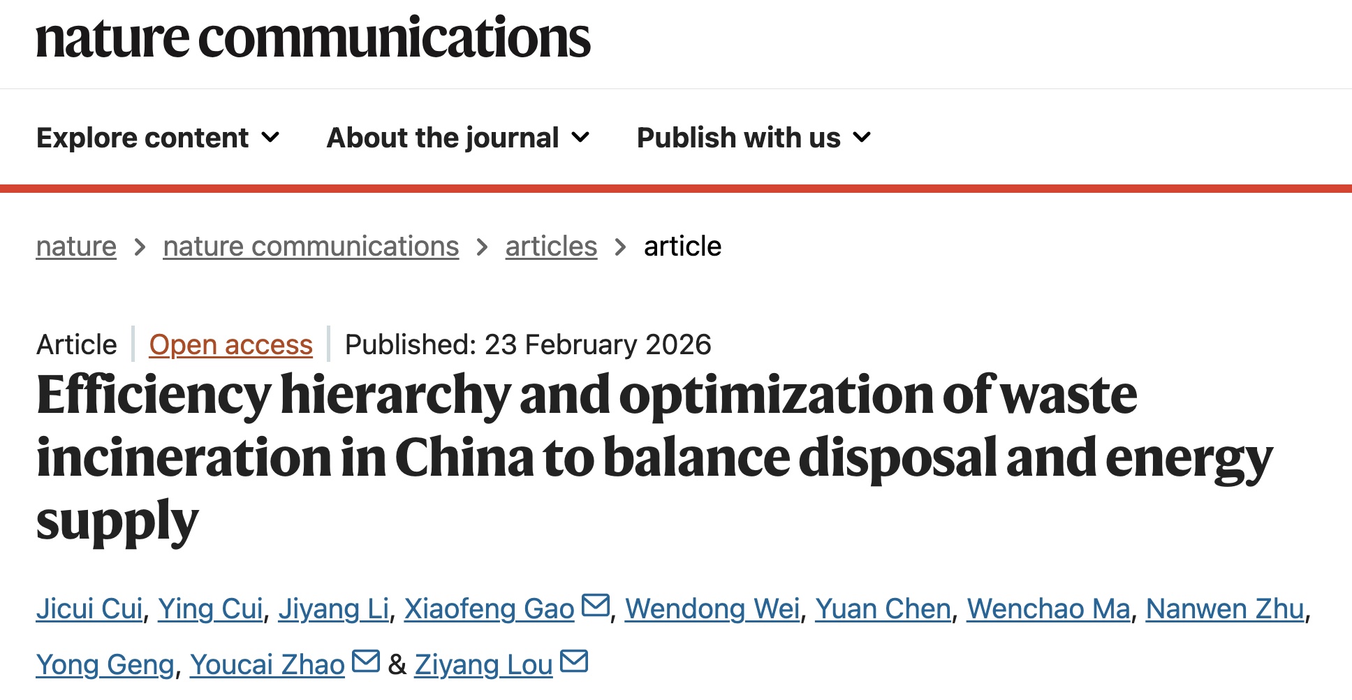 近日,上海交通大学环境科学与工程学院楼紫阳教授团队在Nature Communications在线发表了题为“Efficiency hierarchy and optimization of waste incineration in China to balance disposal and energy supply”的研究成果。研究系统梳理了我国垃圾焚烧发电行业的发展现状,构建了基于能源回收效率的层级分类框架,预测了未来能源供给潜力,并提出针对性优化策略,为我国焚烧事业的高质量发展和焚烧技术未来定位提供方法学支撑。论文第一作者为上海交通大学环境科学与工程学院博士研究生崔纪翠,通讯作者依次为重庆大学环境与生态学院高小峰副教授、同济大学环境科学与工程学院赵由才教授和上海交通大学环境科学与工程学院楼紫阳教授。第一完成单位为上海交通大学。